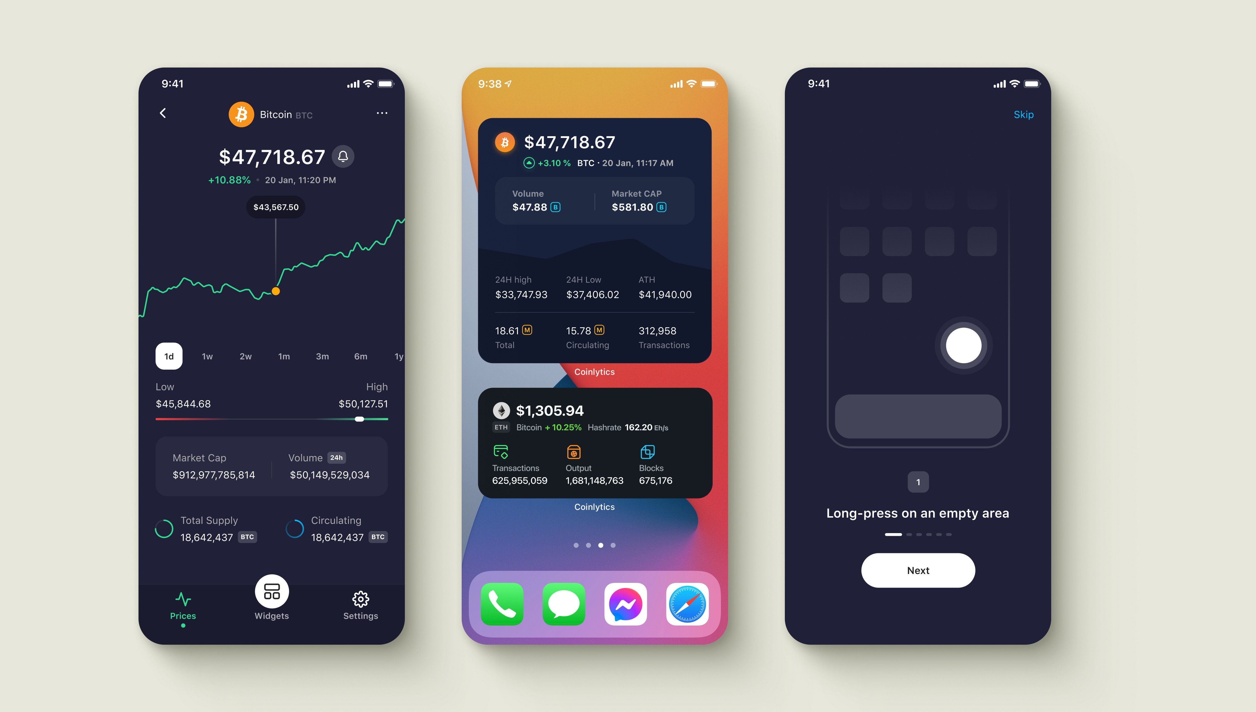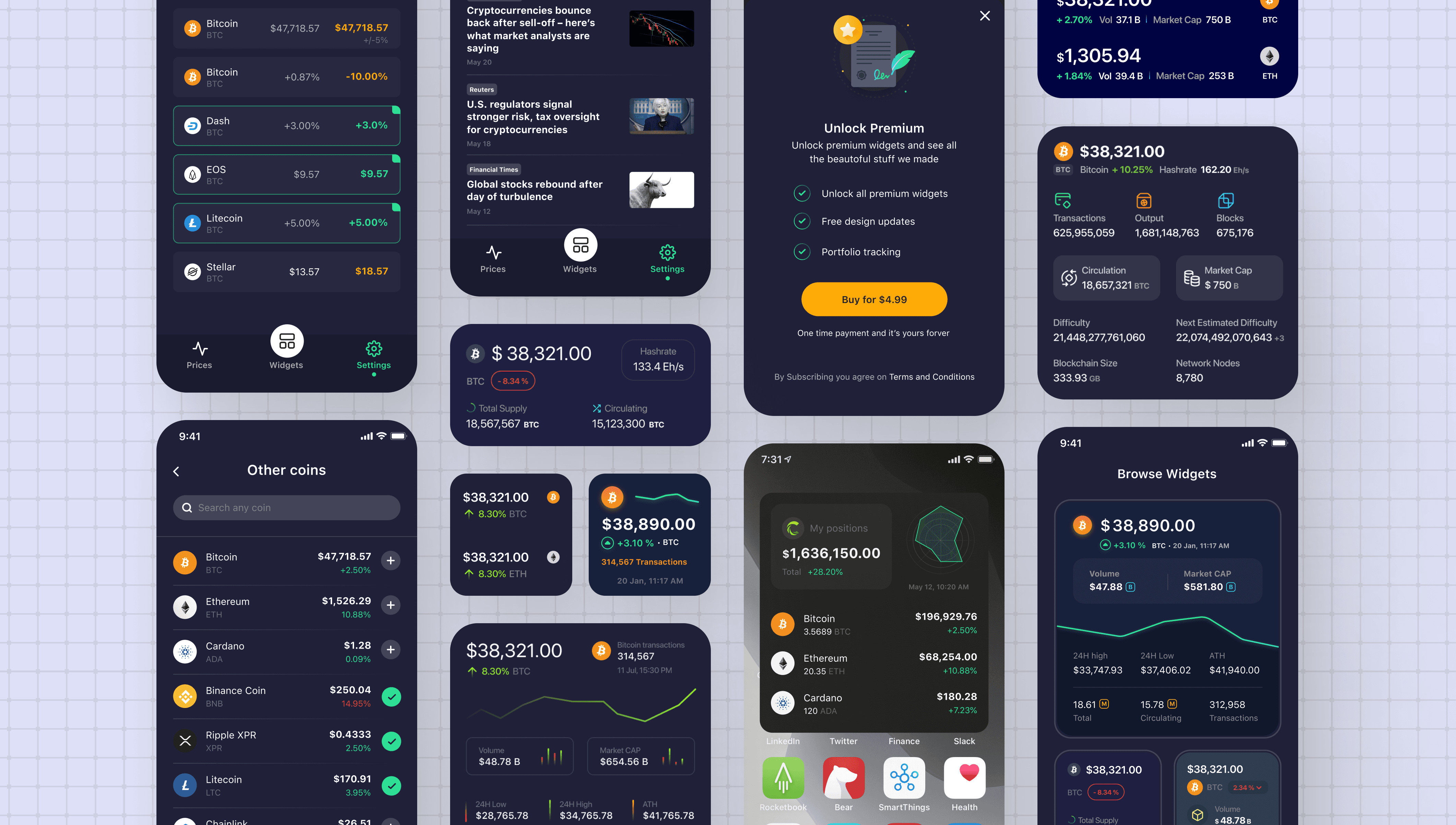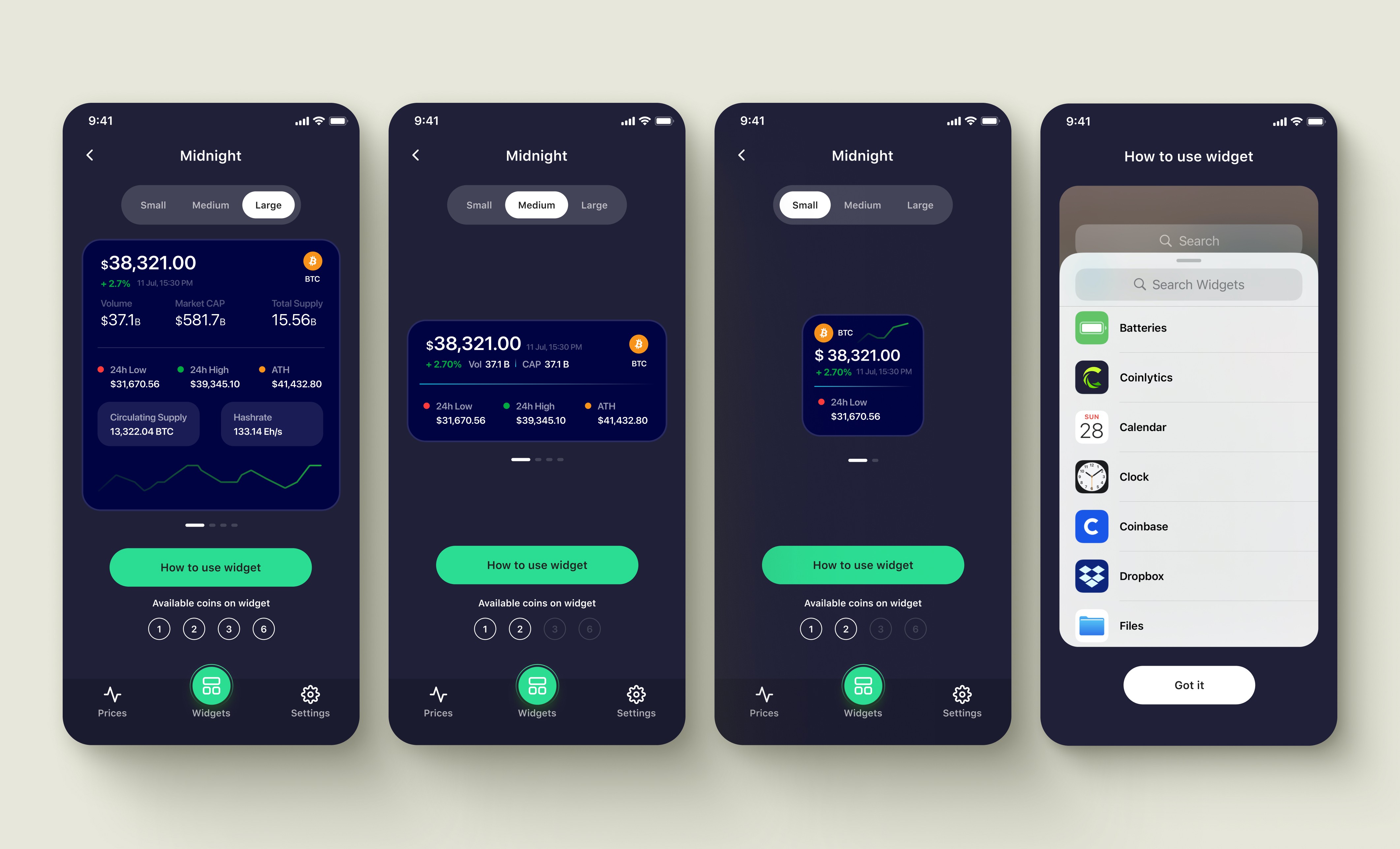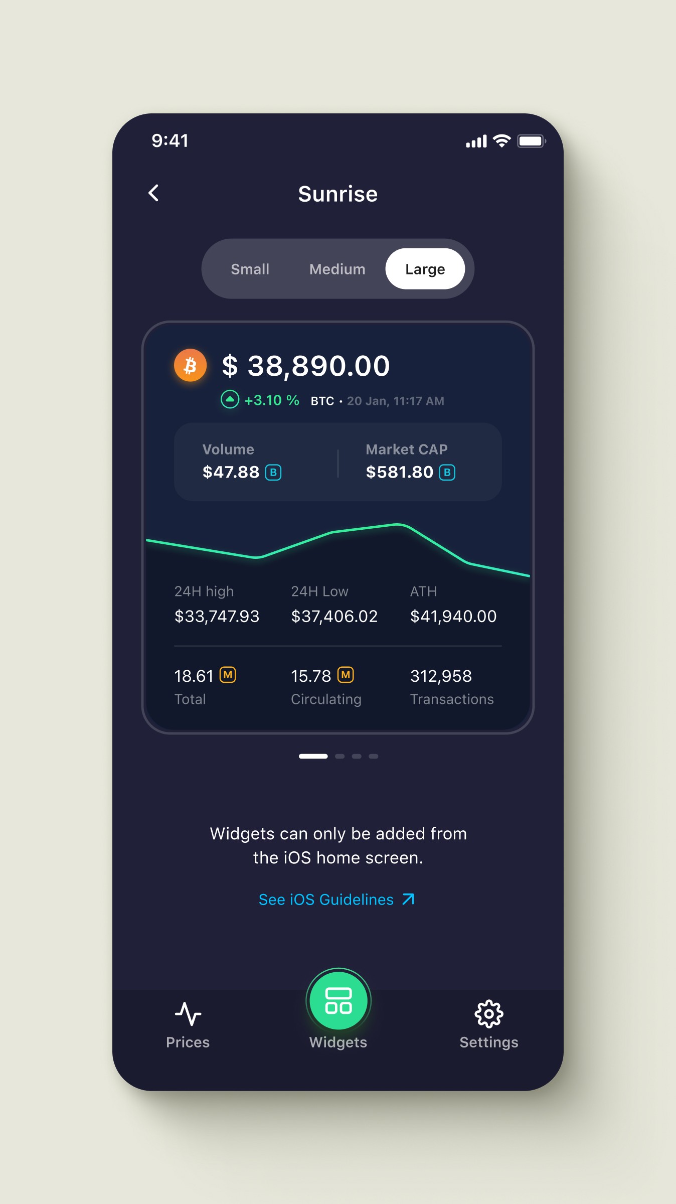 Widgets promised comprehensive crypto analytics on tiny home screen spaces. I needed to display price, percentage change, volume, market cap, and blockchain metrics without overwhelming users or sacrificing readability across three widget sizes.