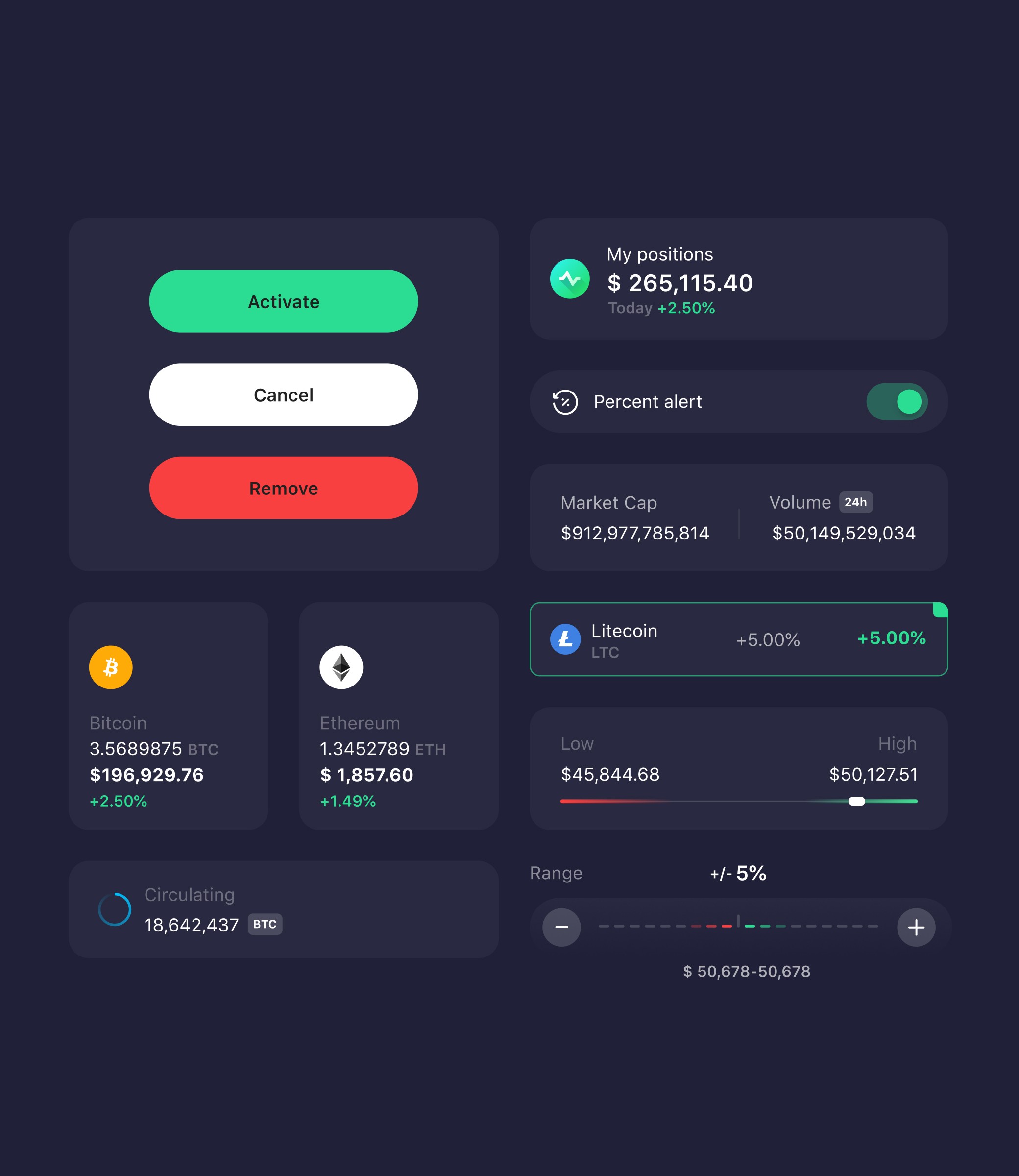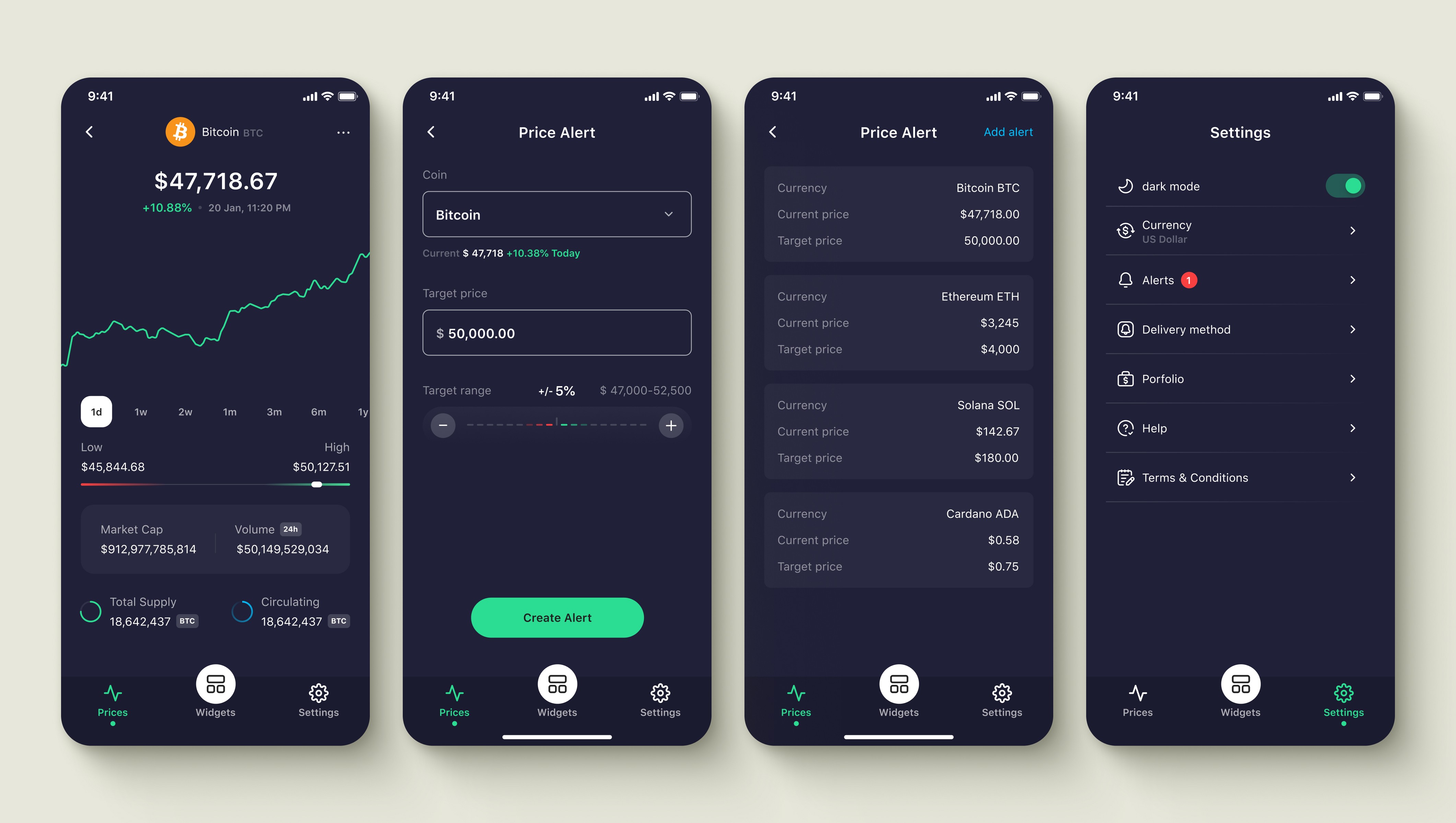 Beyond widgets, I designed advanced alerts covering price, percentage change, market cap, volume, blockchain updates, and wallet tracking. Users received notifications via push, SMS, or email based on preference.