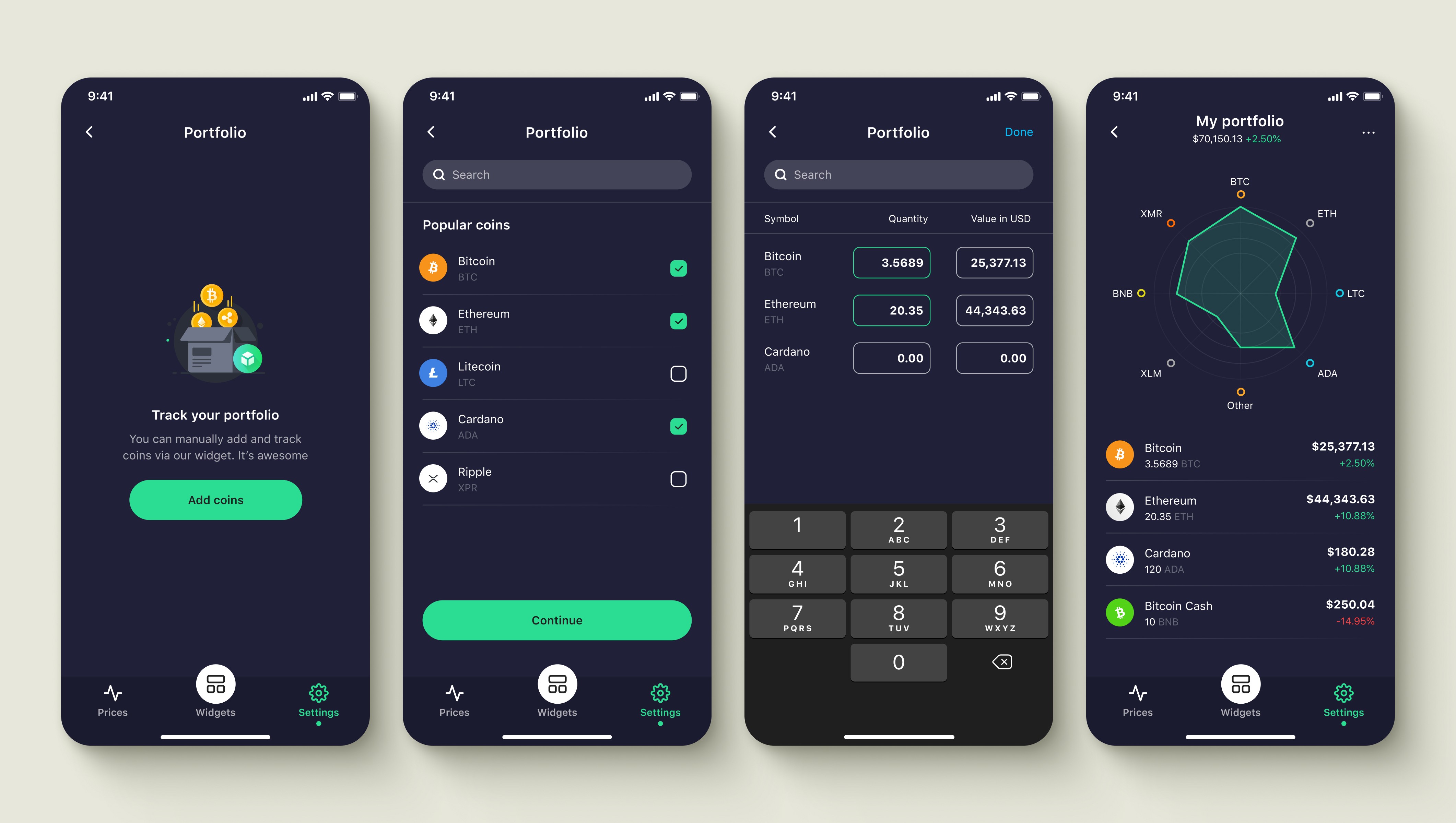 Technical constraints prevented connecting crypto wallets directly. I proposed manual coin entry with local storage instead. Users built portfolios without linking accounts, keeping holdings private while tracking performance.