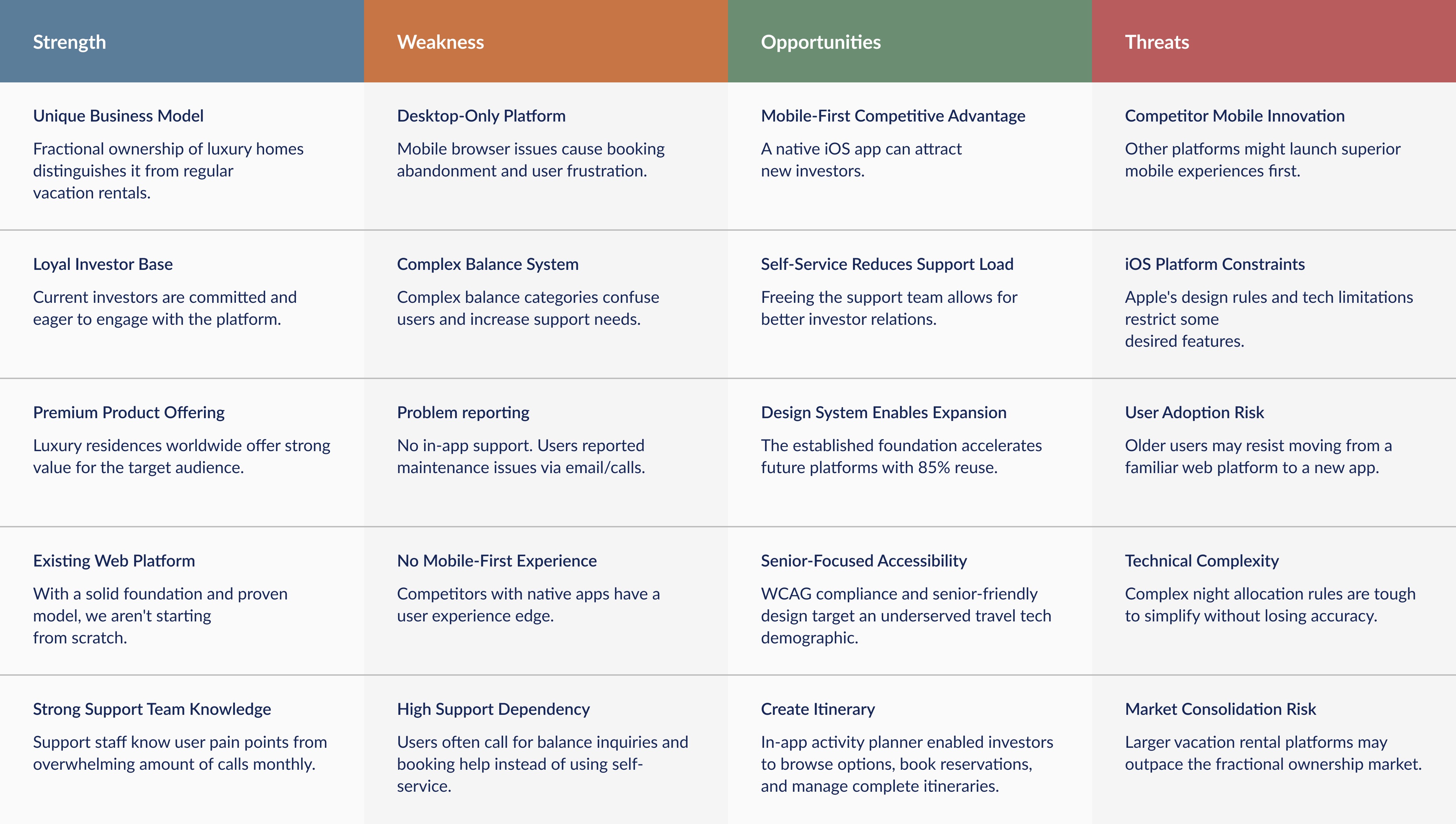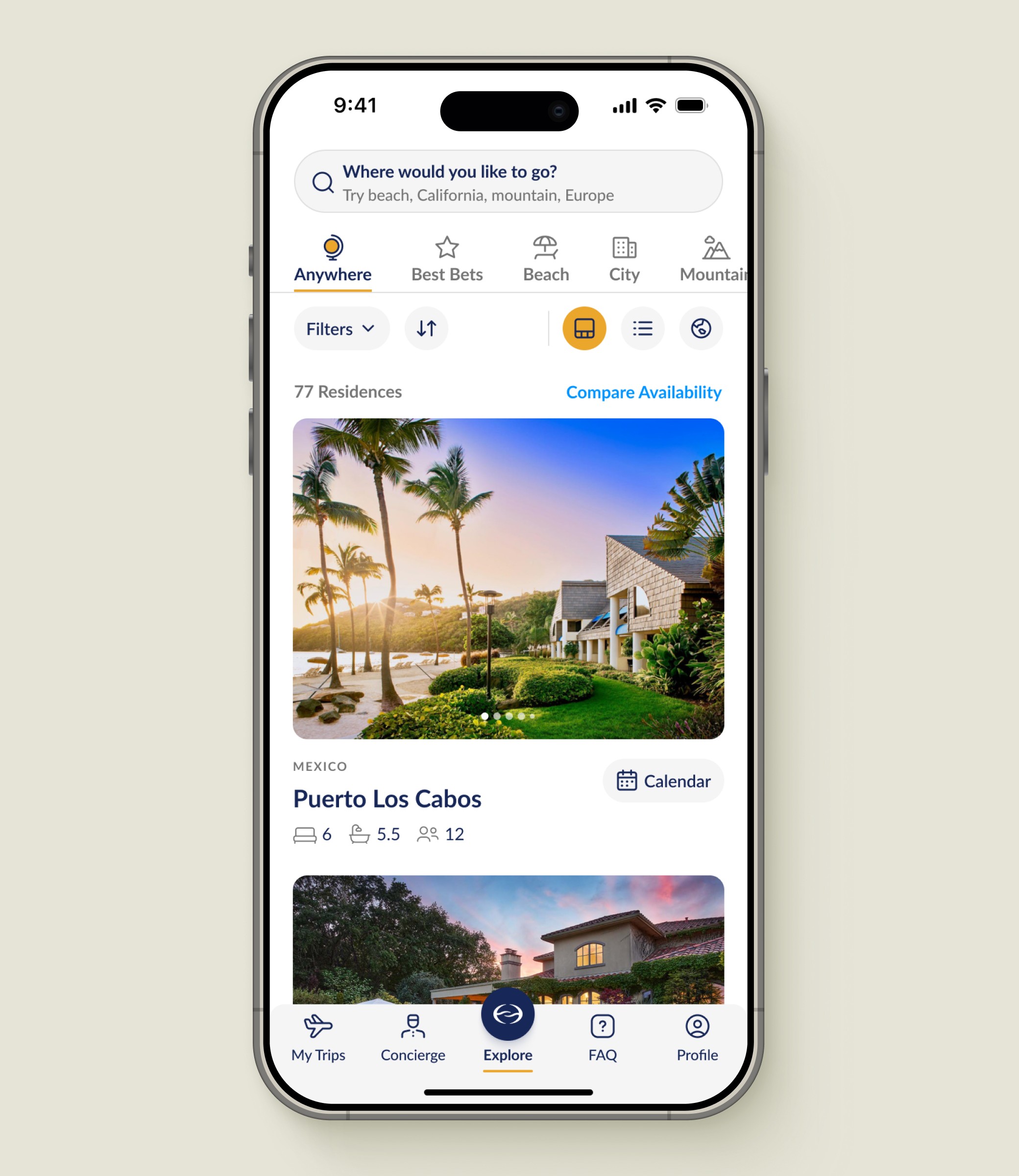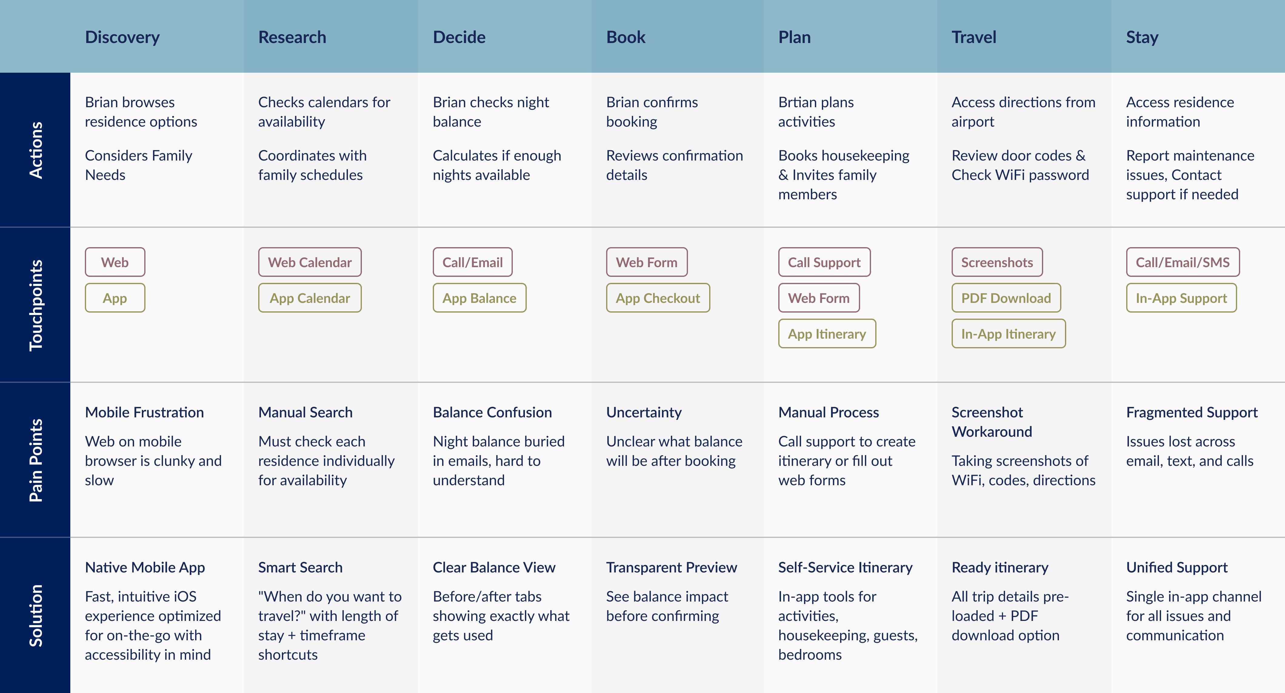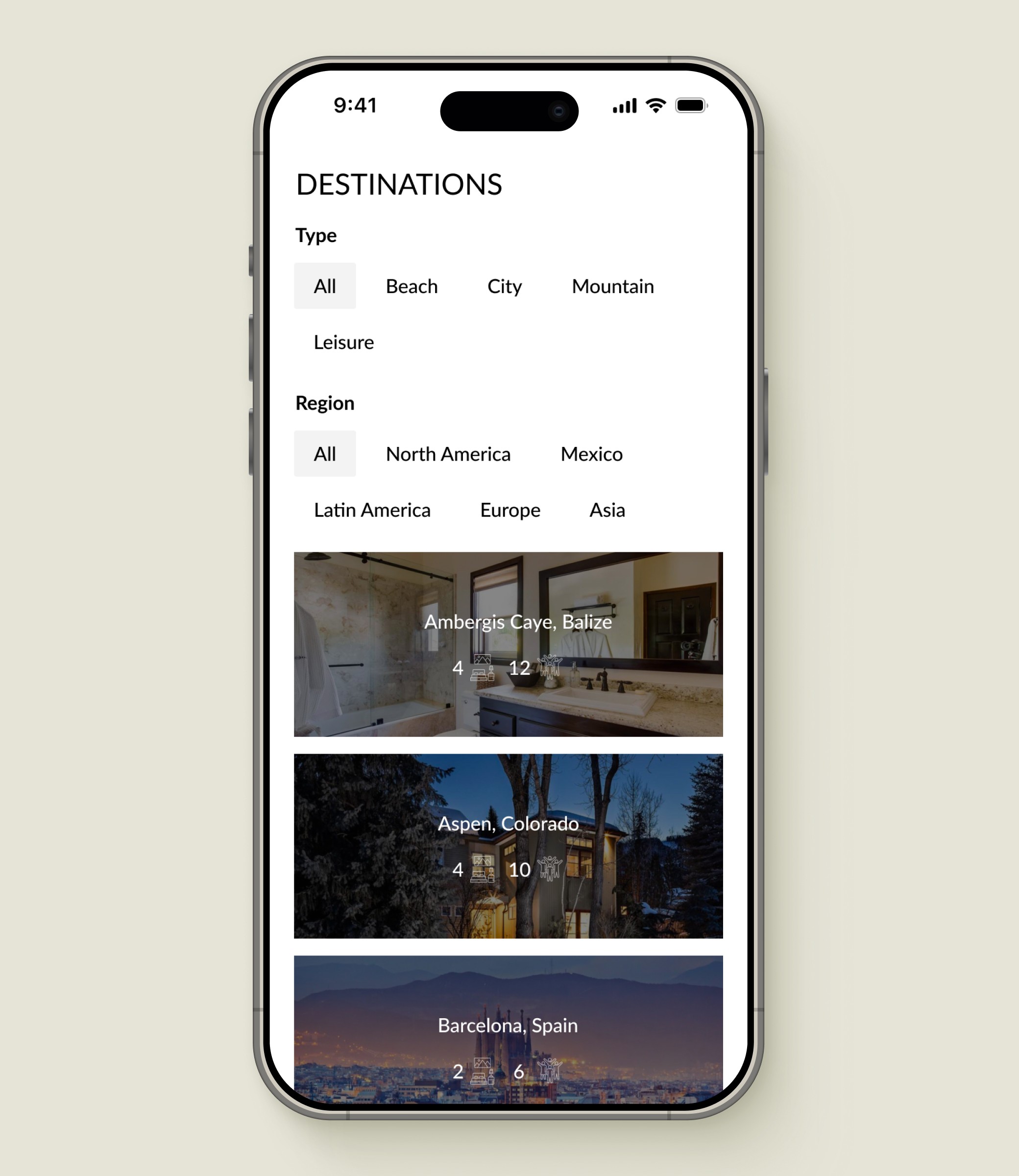 A mobile-first iOS app empowering investors to independently search residences, book stays, view balance impact, and manage trip itineraries - all without contacting account managers.