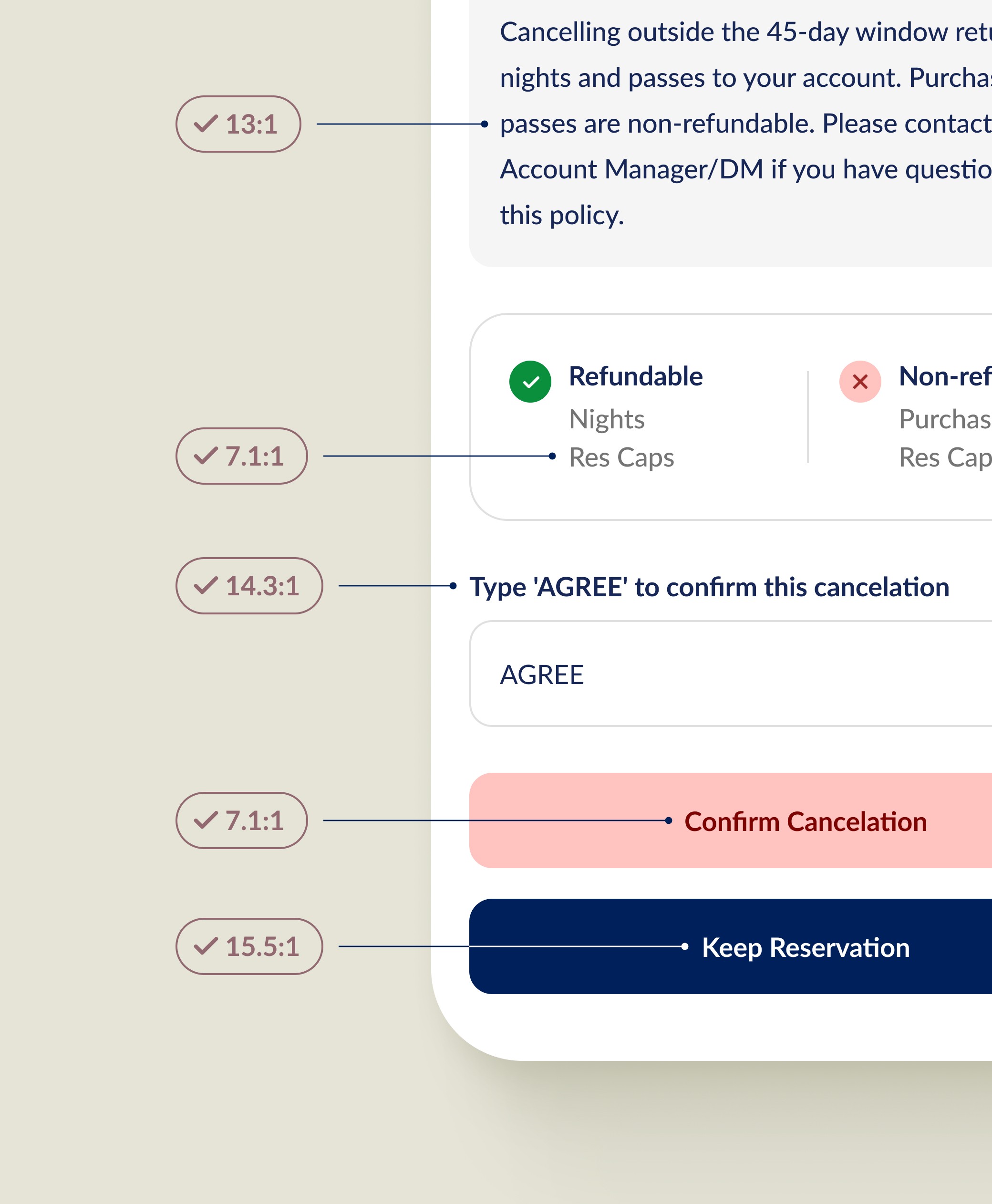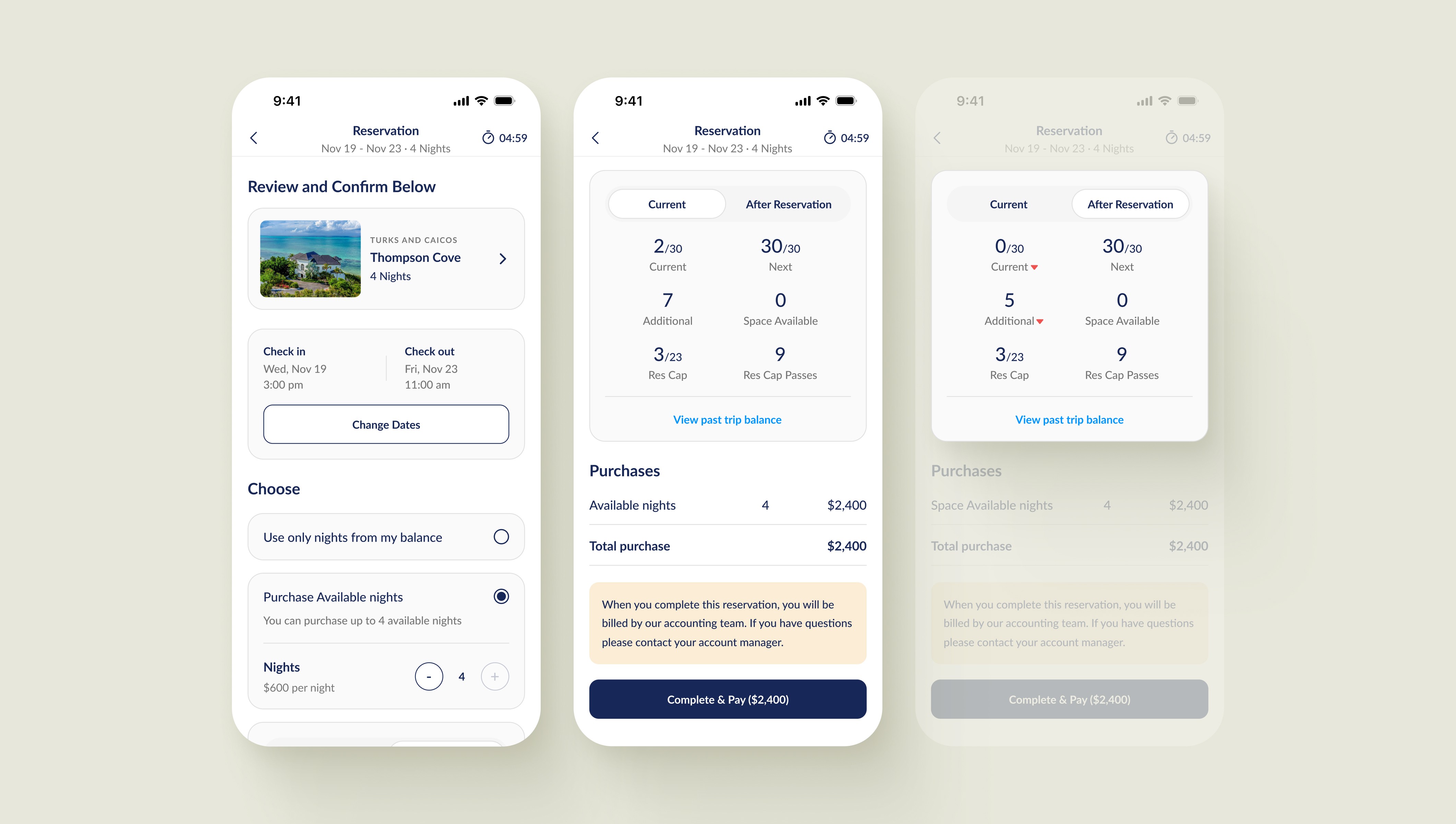 The balance system involves multiple night categories with complex allocation rules. After consulting account managers who handle investor bookings and balance questions, I designed a before/after comparison showing balance impact. An itemized breakdown at the bottom reveals exactly which night categories are used, including any purchased nights requiring payment.