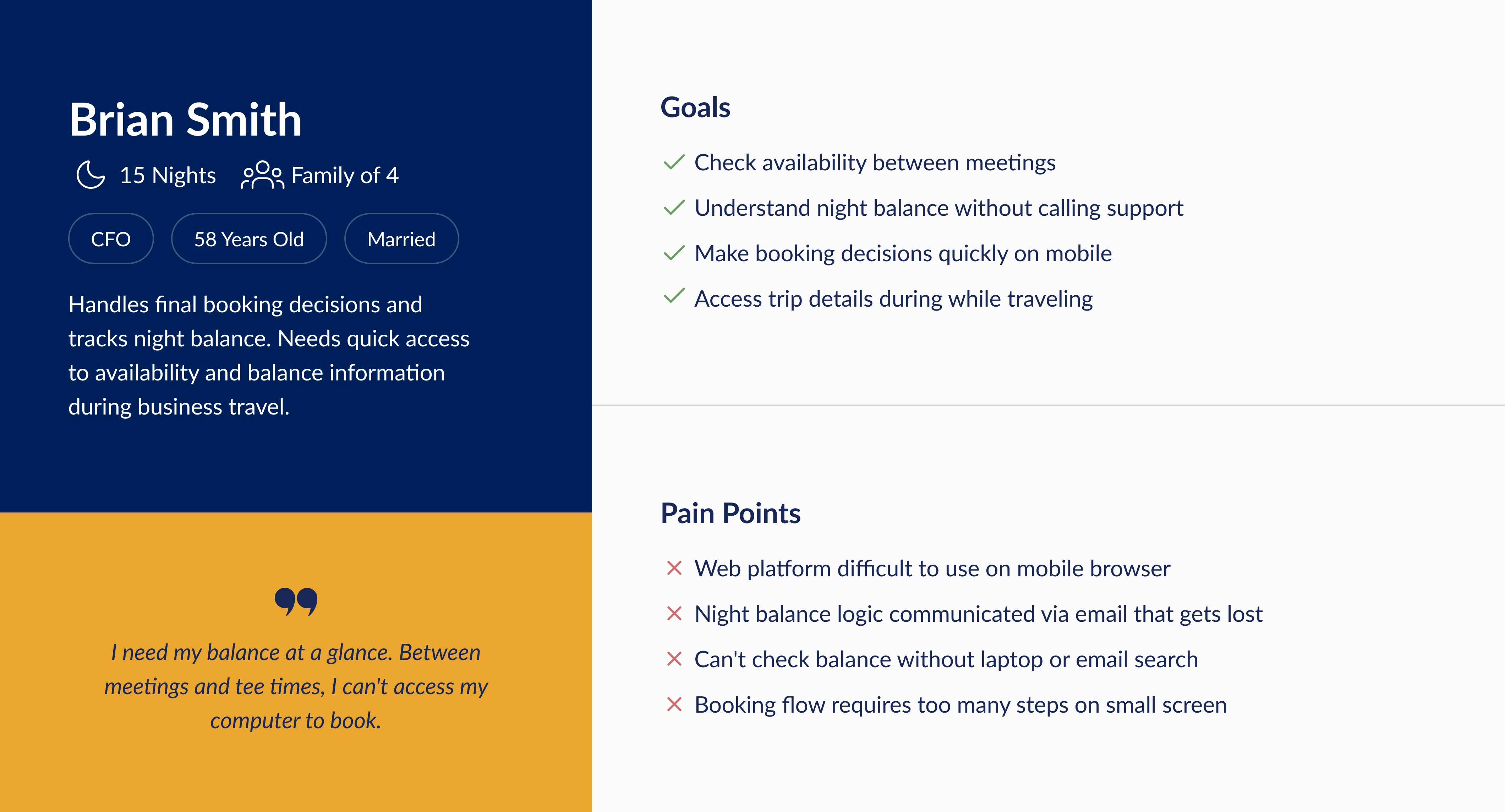 Brian Smith, 58, recently retired financial advisor, represents Voyager's largest investor demographic. After years of using trading platforms and financial software, Brian is tech-savvy but expects intuitive design that respects his intelligence. He makes booking decisions on-the-go between activities. Brian embodies 68% of Voyager investors.