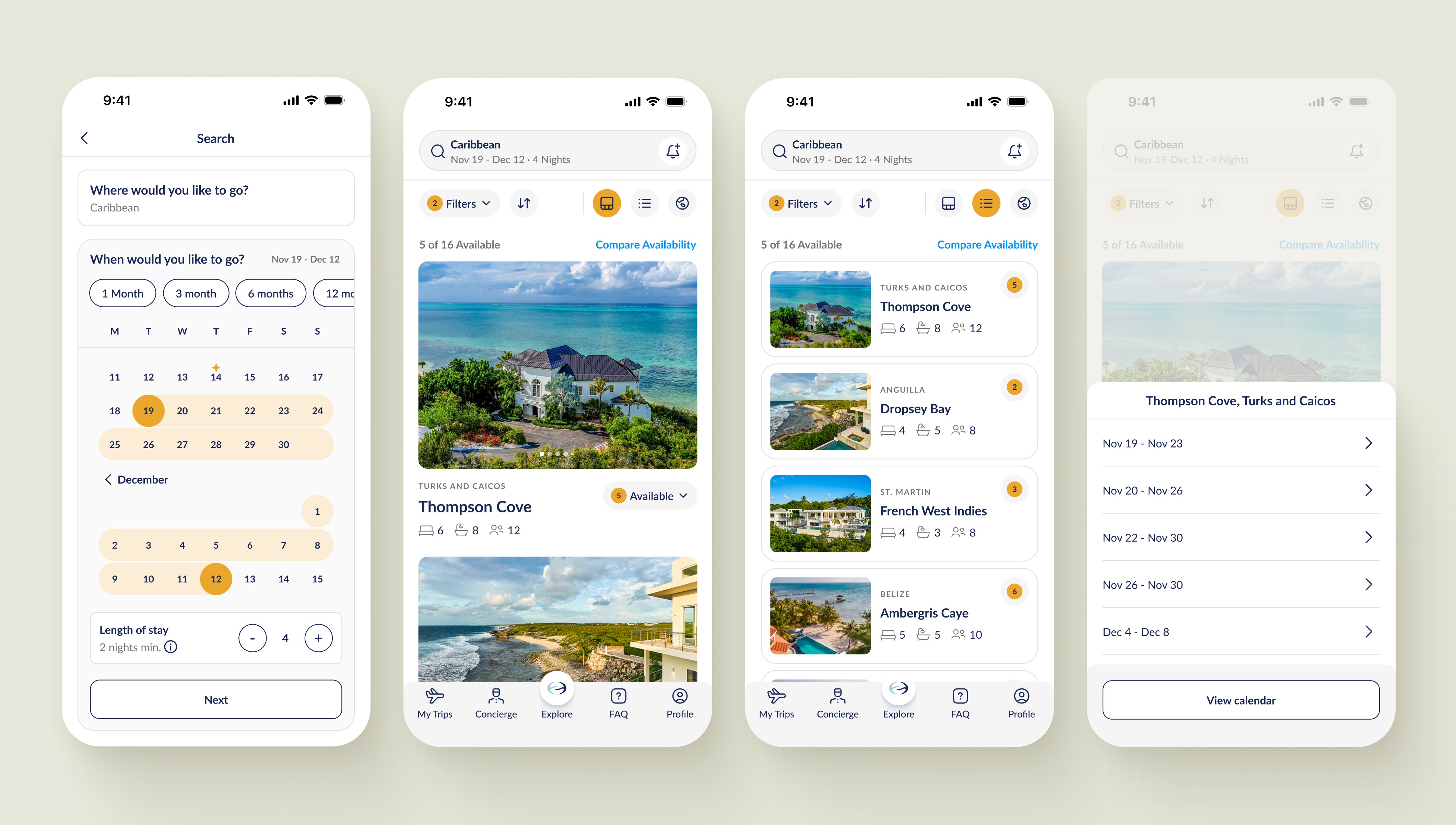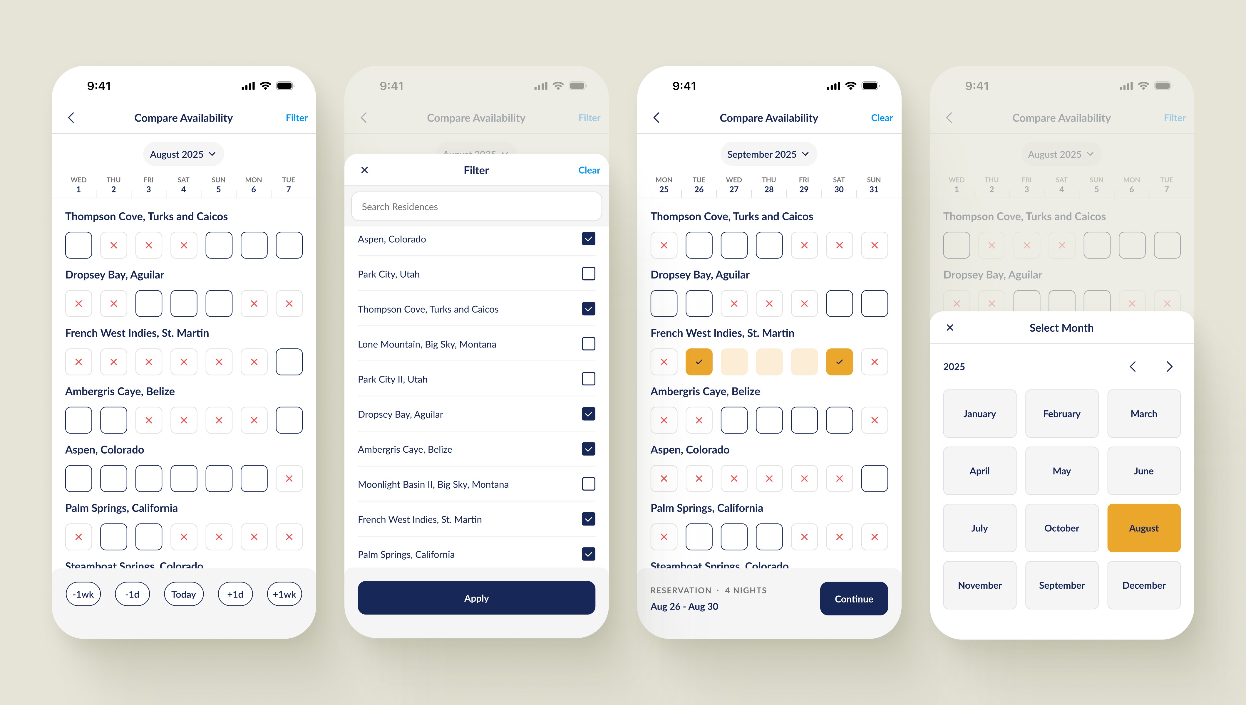 Investors needed to compare availability across multiple residences. While showing residence images aids recognition over recall, I prioritized seeing more residences in this context - removing images and keeping only names and locations added 3-4 more properties in the viewport. Unlike web where users memorized dates and booked on separate pages, mobile users select available dates and book directly without leaving the comparison view.