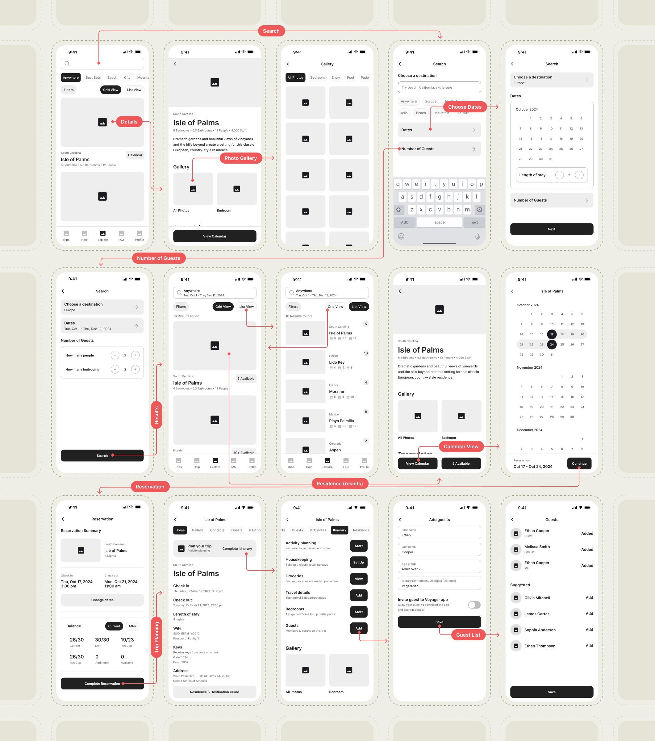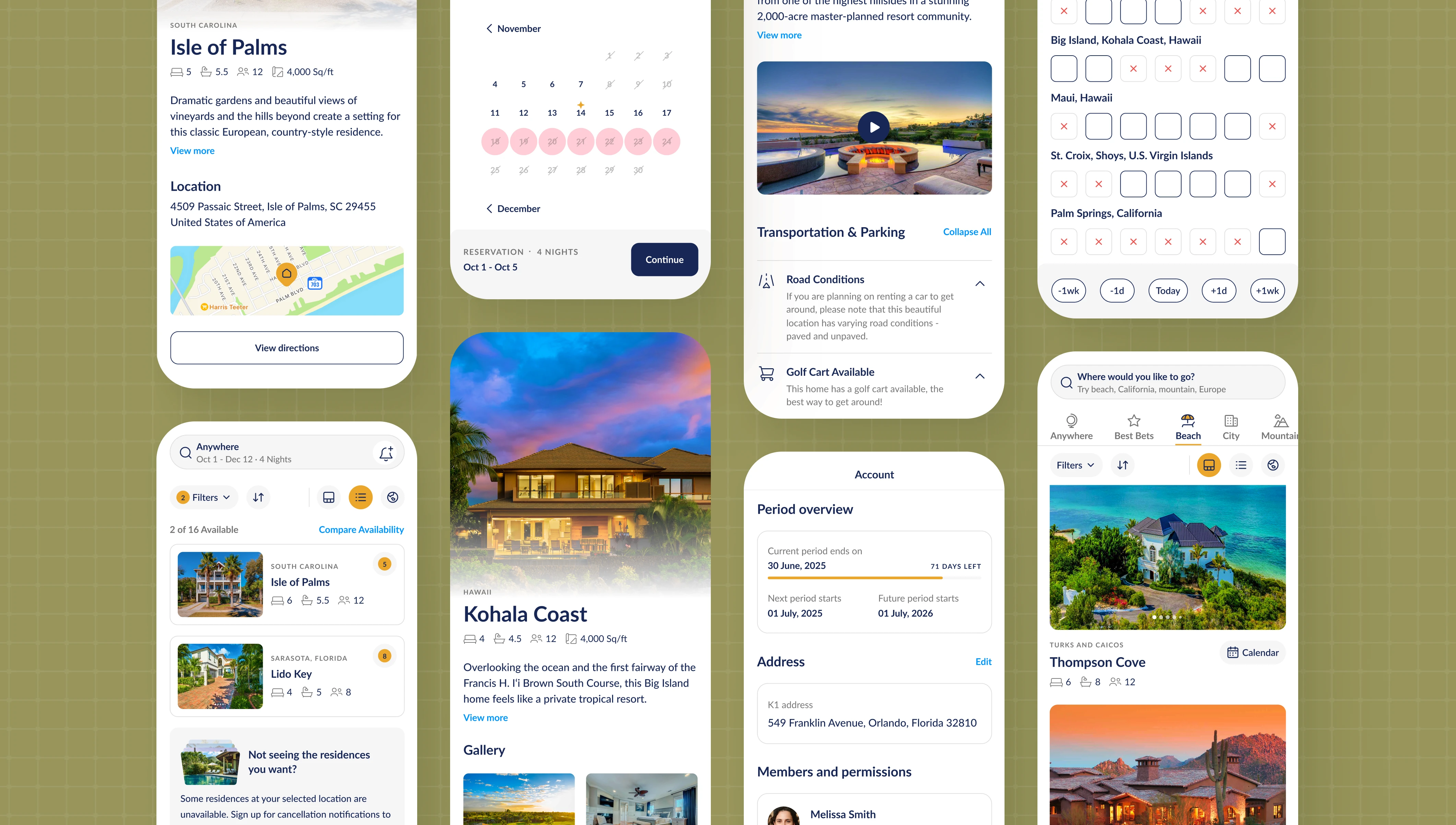Voyager's search accesses 80+ residences. Unlike traditional platforms requiring exact dates, investors want flexible trips within broader timeframes. I redesigned search around length of stay and flexible date ranges. Results show available residences with dropdowns displaying matching date slots.