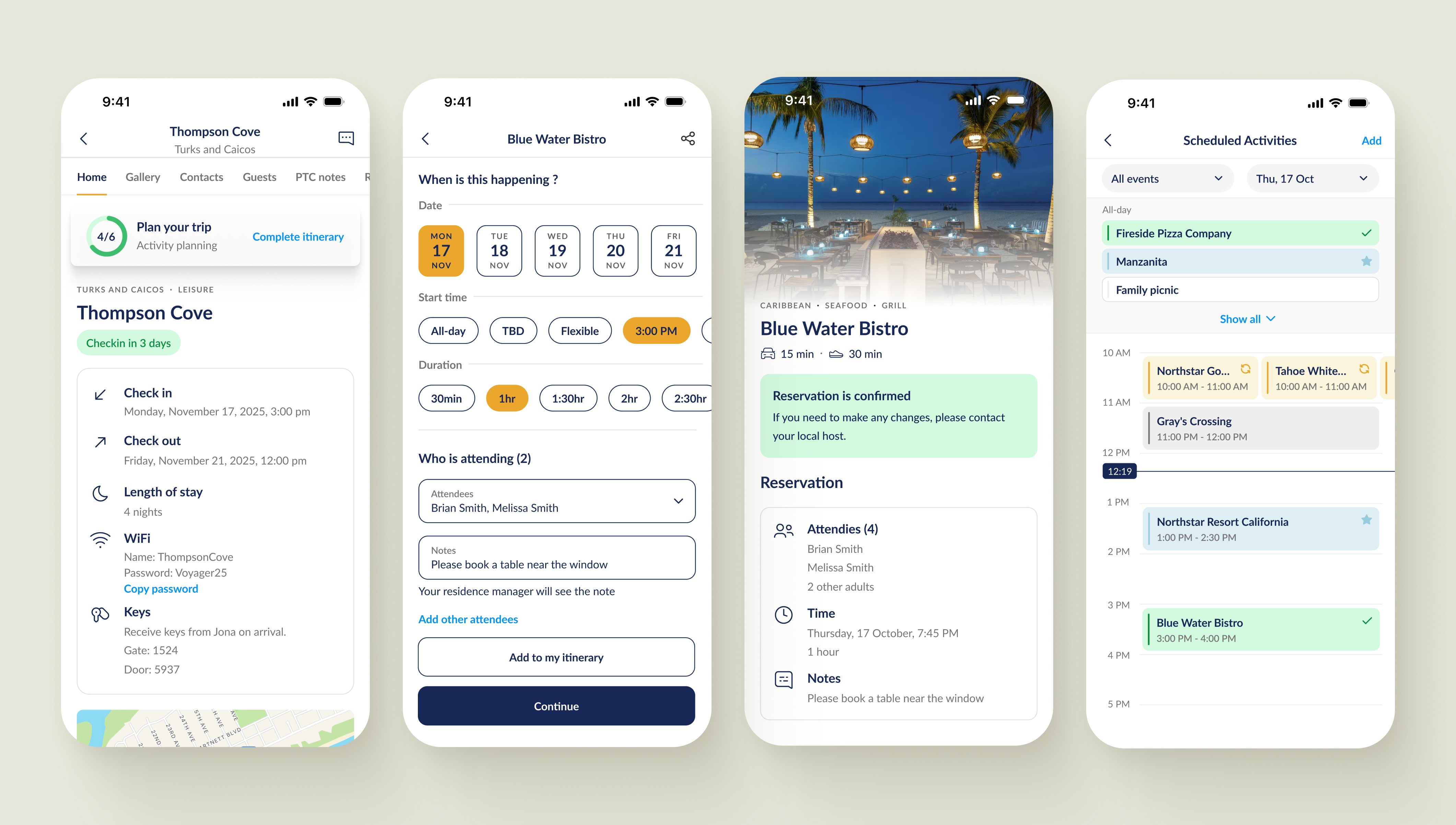 Guests needed help planning activities at residences. Previously, Voyager sent PDF lists of local dining and entertainment options via email, then manually coordinated reservations through calls and texts. I designed a self-service activity planner where guests browse options, add activities to their calendar as pending, and Voyager confirms reservations directly in-app.