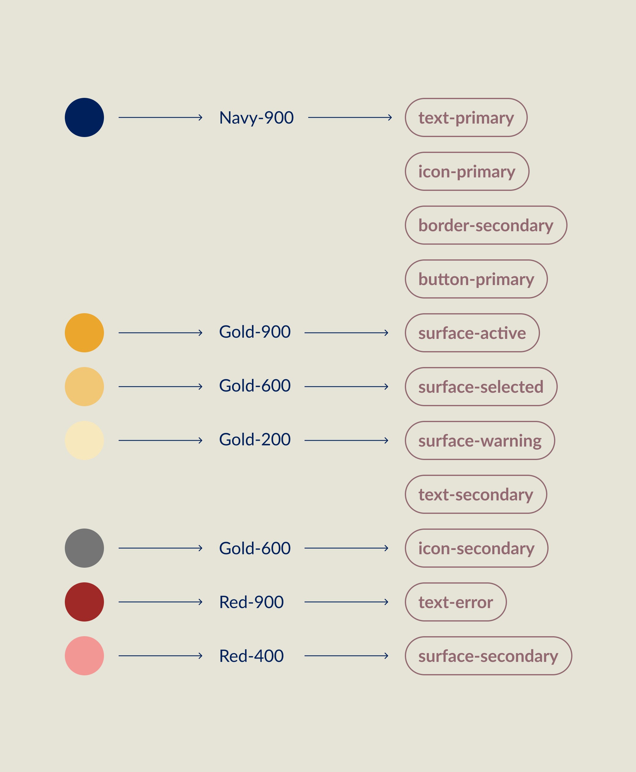 I established semantic color tokens describing purpose over appearance. Instead of "blue-500," I used context-specific tokens like "text-primary," "surface-active," and "border-secondary." This ensures tokens remain meaningful when values change, maintaining consistency across iOS and web while helping developers understand intent.