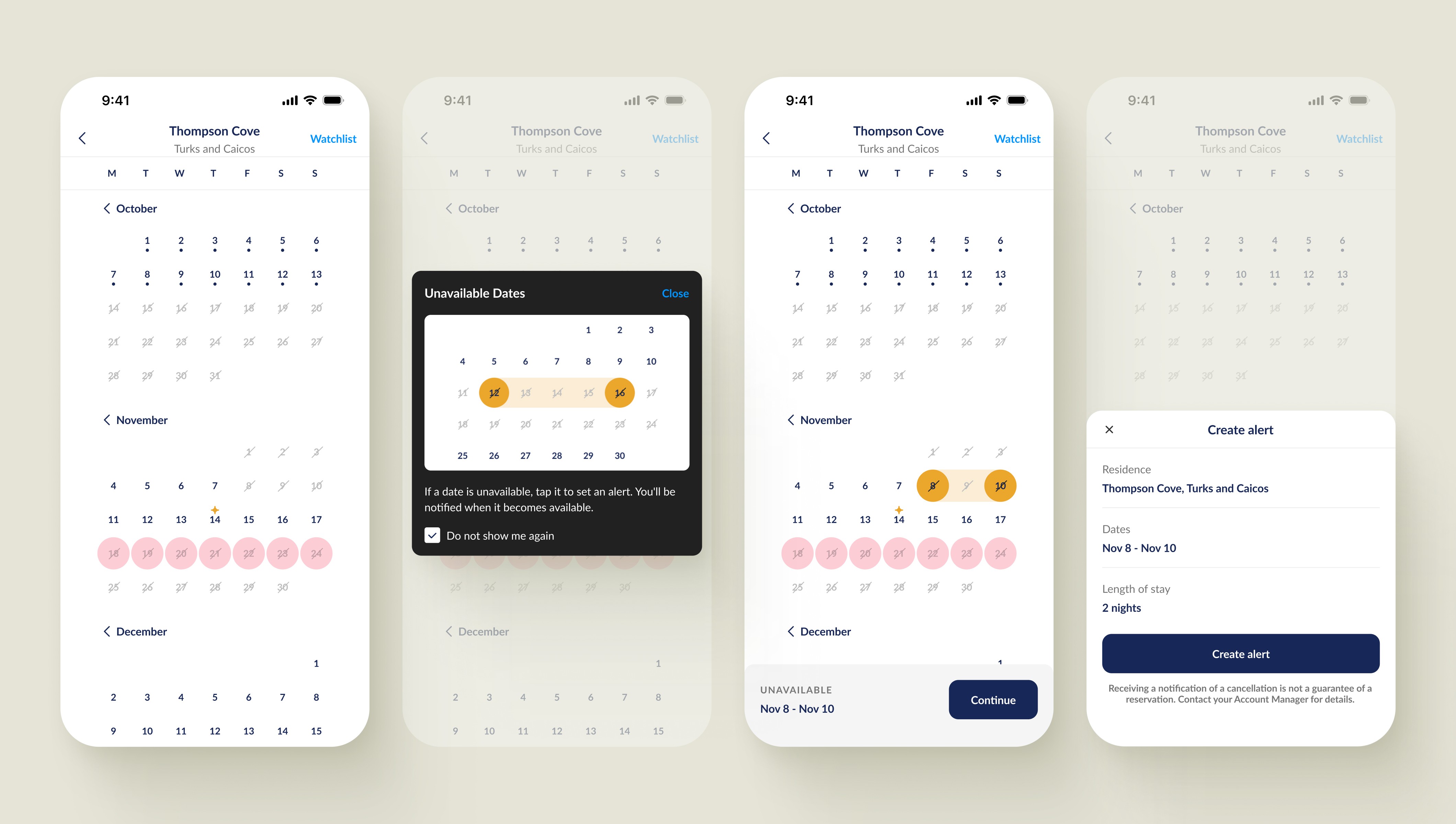 Investors wanted alerts for unavailable dates at favorite residences. The challenge: crossed-out dates signal non-clickable, but users needed to click them to set alerts. I tested video tutorials, alternative visual indicators, and snackbars to show that crossed-out dates were clickable. Video won because users ignored static text. A modal appears after 5 seconds, animating the interaction.
